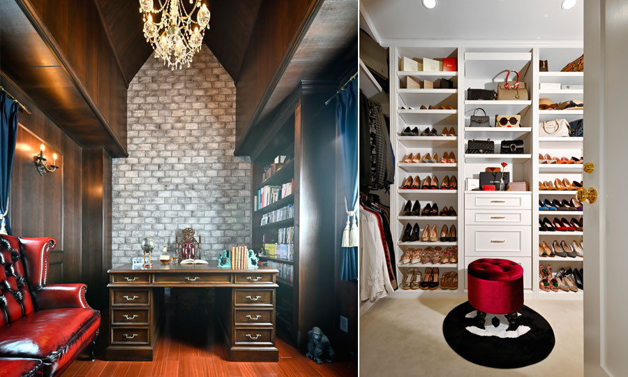 Study & Dressing Room(左)チェリー材を茶色に染色した壁と石貼りの壁が映画のワンシーンの様にカッコいいご主人の書斎。